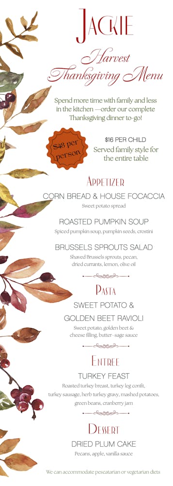 All Beer $5 during Happy HourThis Thanksgiving, gather at Jackie for a warm, festive celebration of comfort food done right. Our Thanksgiving Feast brings together all your holiday favorites—think juicy roasted turkey, velvety mashed potatoes, seasonal sides, and decadent desserts—each elevated with Jackie’s signature modern flair.