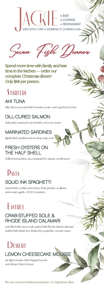This Christmas Eve, Jackie invites you to savor the timeless Feast of the Seven Fishes—reimagined with bold flavors, refined technique, and holiday charm.