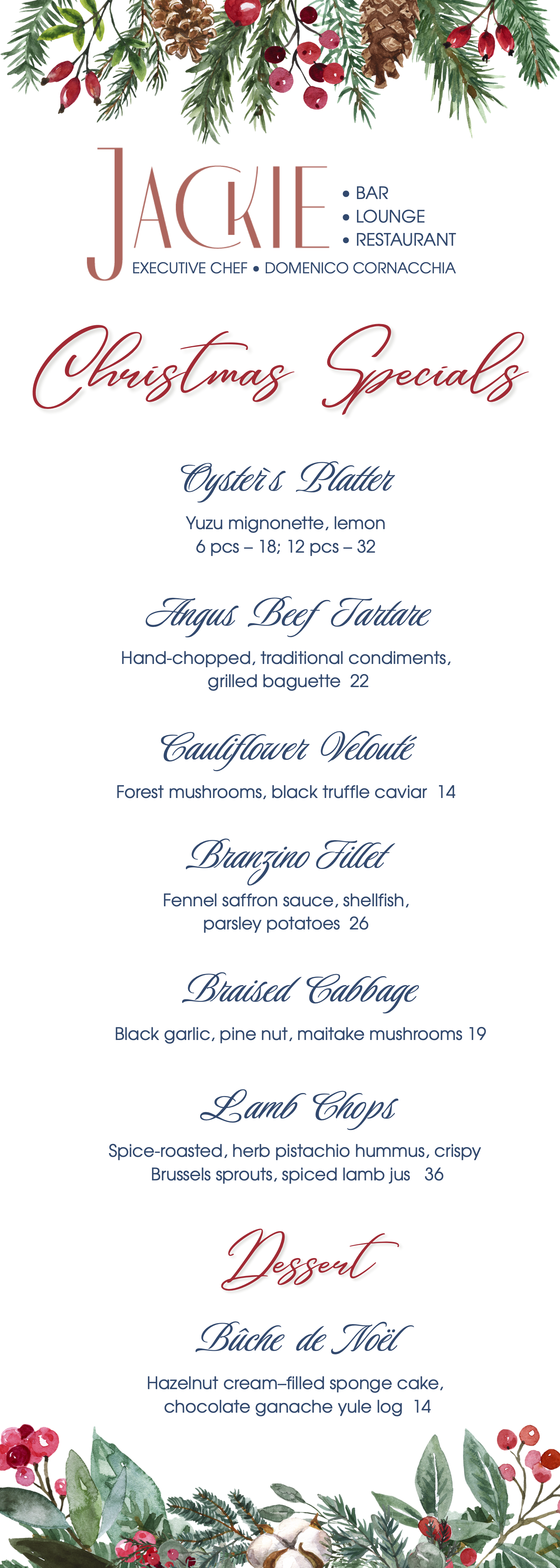 Celebrate the warmth of Christmas Day at Jackie with a festive dinner that blends your favorite classics from our regular menu with a selection of holiday specials crafted just for the day.